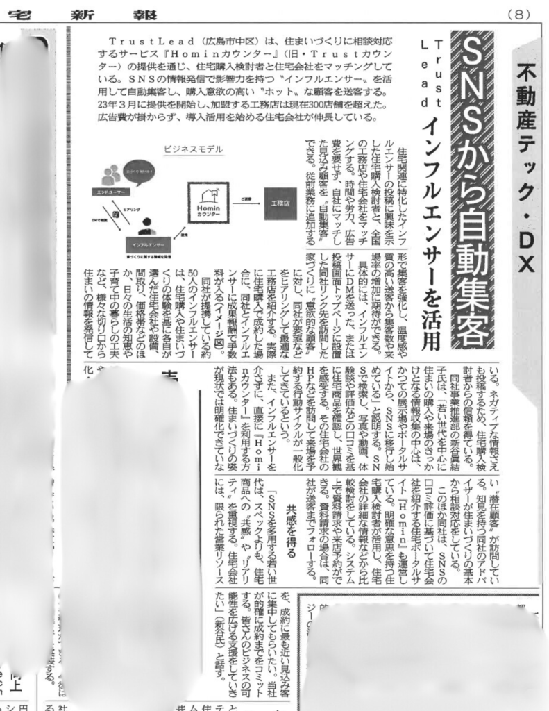 このたび、弊社が提供する住宅業界向けの住宅相談サービス「Trustカウンター」を「Hominカウンター」に名称変更したことが住宅新報にて紹介されましたことをお知らせいたします。